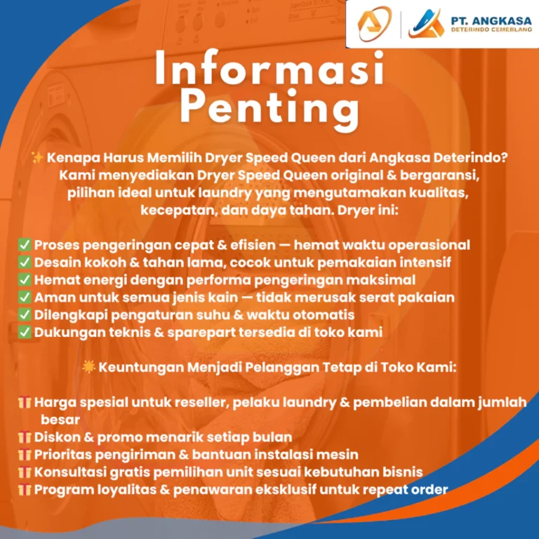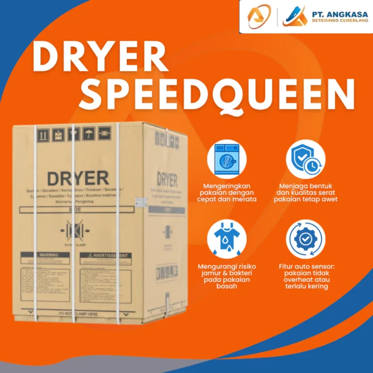 Dryer Speed Queen Komersial hadir sebagai solusi andalan untuk proses pengeringan super cepat, efisien, dan tahan lama. Dirancang untuk kebutuhan laundry harian dengan intensitas tinggi, mesin ini memberikan hasil kering sempurna tanpa merusak serat kain.Dikenal sebagai salah satu mesin pengering paling tangguh di dunia, Speed Queen menjadi pilihan banyak pelaku laundry profesional, hotel, guest house, hingga laundry industri di seluruh Indonesia. Cepat kering = produktivitas meningkat!